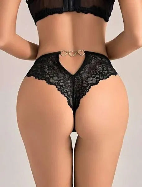 Dantel Siyah Kalp Metal Aksesuarlı Fantezi Külot